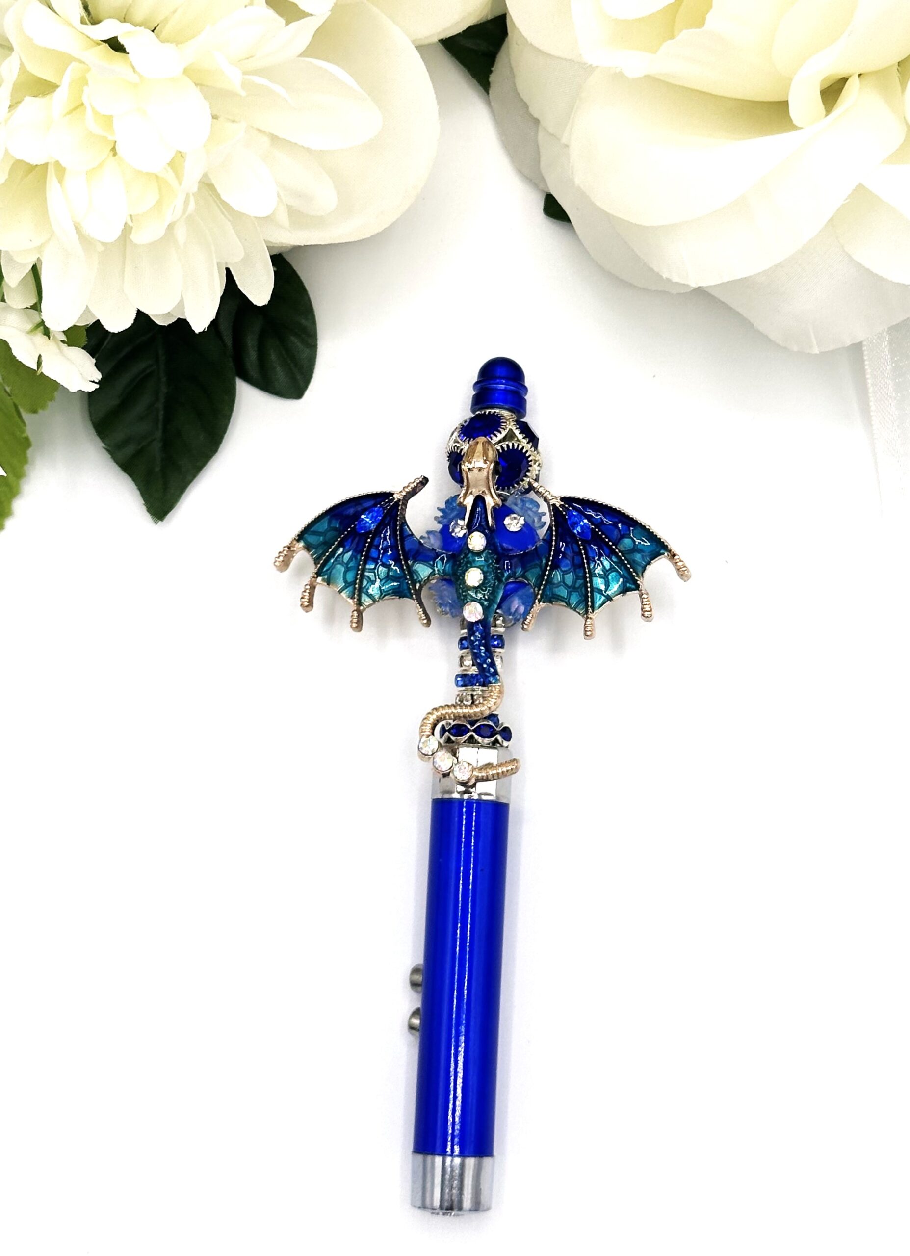 This beaded pointer front has a blue/green dragon and the back has four royal blue clover. surrounded by rhinestones with dangler on the sides. The colors of the changing pointer are: Red,Blue,white plus it blink with just a push of the button. To prevent the batteries from corrosion there is a circular white paper/border between the the first and second batteries. Please unscrew the bottom of the pointer and remover this paper in order for the pointer will work.