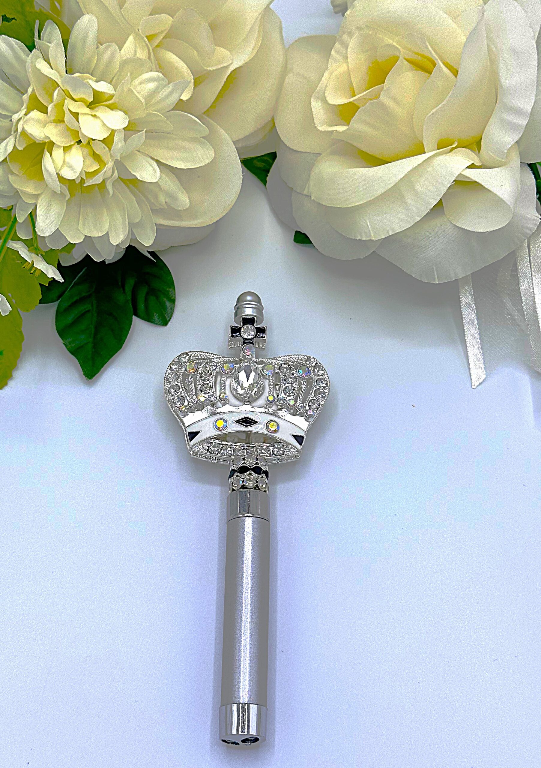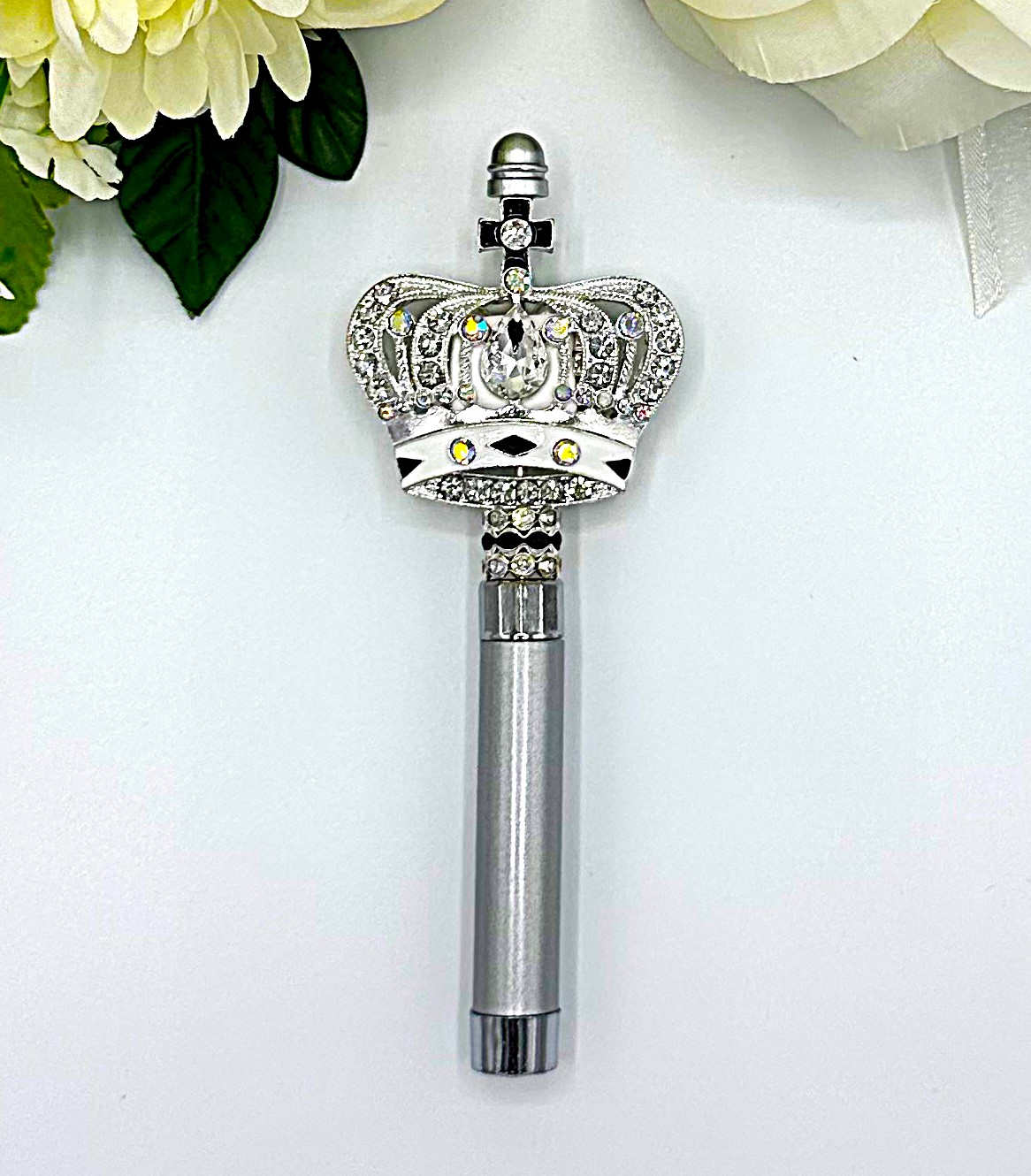 This beaded crown pointer front/back has a cross on top of a silver crown embedded with AB rhinestones. The colors of the changing pointer are: Red,Blue,white plus it blink with just a push of the button. To prevent the batteries from corrosion there is a circular white paper/border between the the first and second batteries. Please unscrew the bottom of the pointer and remover this paper in order for the pointer will work.